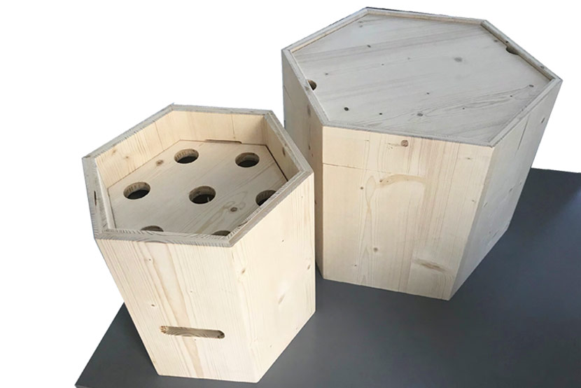 La scatola contiene fino a 7 bottiglie, può avere un tappo cieco per proteggerle durante il trasporto ed è possibile inserire al centro un cadeau di complemento. Diventa inoltre un elemento d’arredo che può creare un mobile cantina.